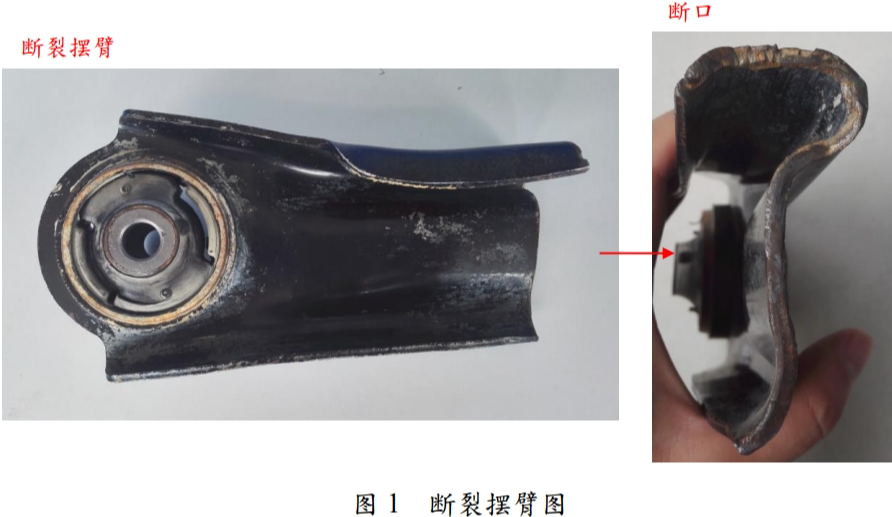 客户汽车摆臂设计使用寿命10万公里,行驶4万公里后发生断裂失效,针对客户送检断裂摆臂样品进行测试分析,以期找出失效原因。