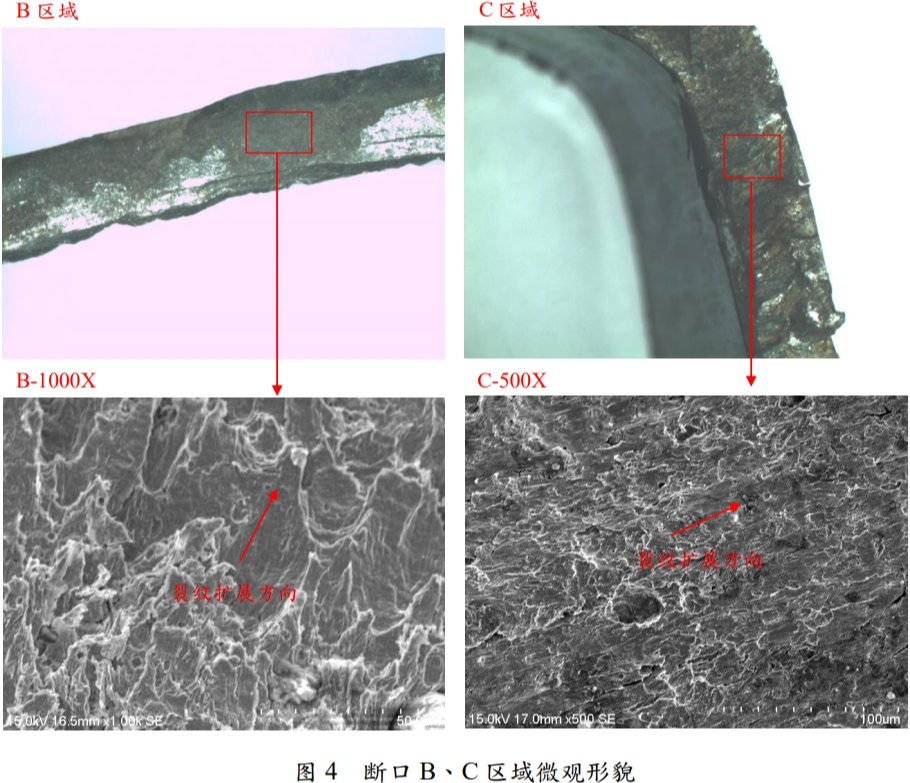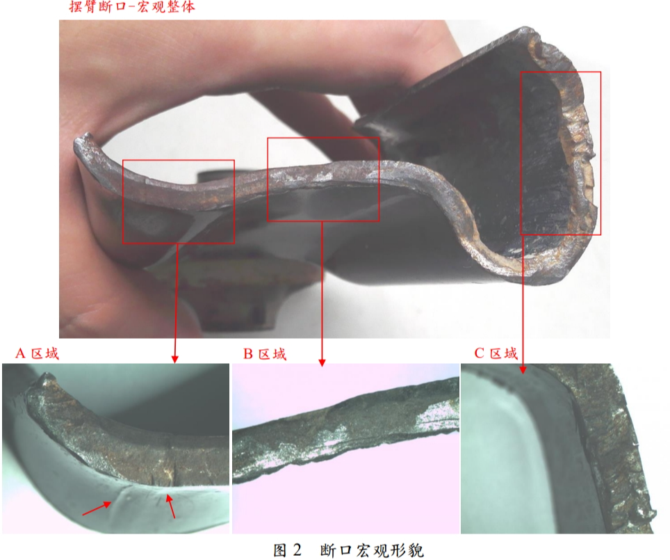 2.摆臂断口B区域是韧性断裂,为裂纹扩展区;C区域为最终断裂区。