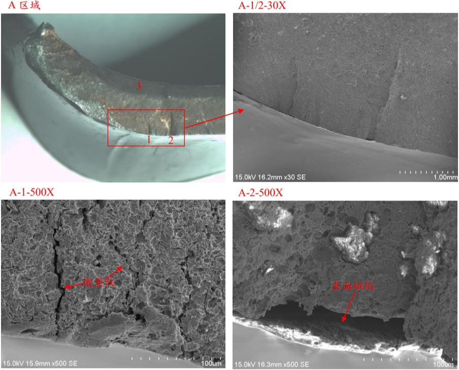 1.摆臂断口A区域存在两处台阶,位置1可观察到从边界向内延伸的微裂纹;位置2表面存在明显的表面缺口缺陷;位置3可观察到明显的撕裂韧窝,为韧性断裂。A区域1、2位置为裂纹源。