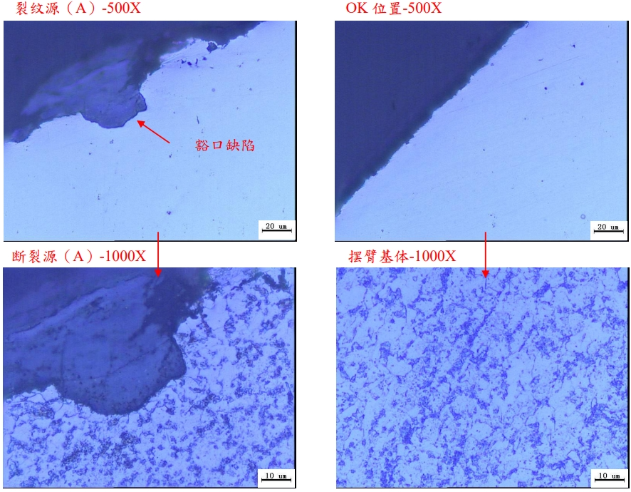 2.摆臂裂纹源区域基材表面存在豁口缺陷且较不平整,易受力集中,OK位置基材表面较为平整;