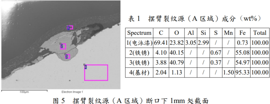4.裂纹源A区域电泳漆层完好,漆层下存在铁锈。说明基材在电泳前已产生腐蚀坑,该位置处在弯曲圆弧处,更易萌生初始裂纹。