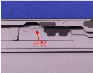 2.外壳裂缝由外侧塑胶底部向内腔基材表面扩展,缝隙逐渐变小;