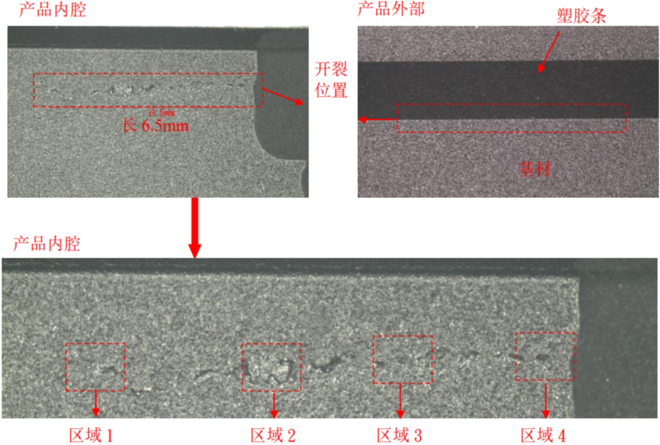 外壳内腔开裂位置对应产品外部塑胶条边缘与基材结合处,该裂纹长约6.5mm,裂纹较为曲折,且宽度不一,两端呈细纹状(如区域1及区域4),中部多为较深的裂缝或较宽的凹槽(如区域2及区域3),其附近未见明显外部作用造成的变形或碰刮伤痕迹,如图2所示。