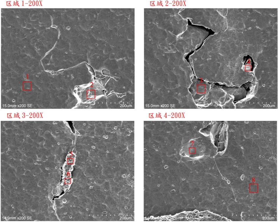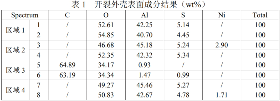 3.区域3开裂处存在异物,EDS测试结果表明其主要含C、O元素,推测该异物可能为塑胶。