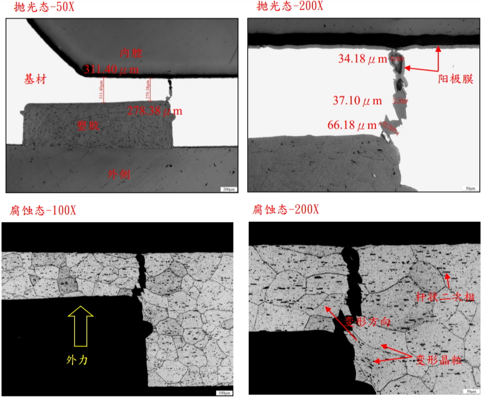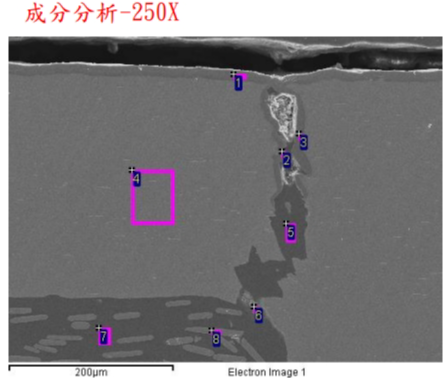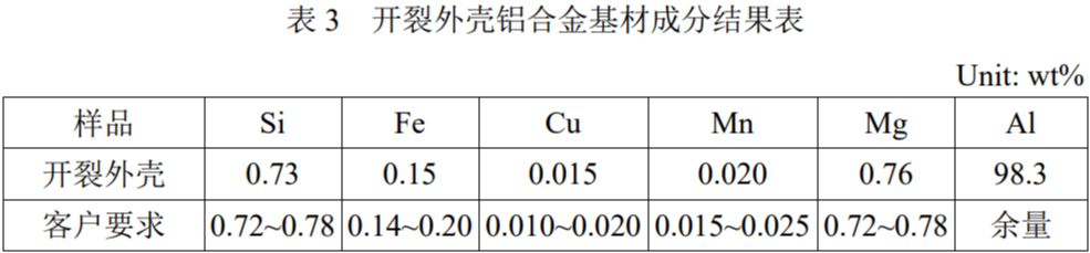 1.外壳裂缝中基材表面可检测到阳极膜成分,且存在较完整的阳极膜结构,说明裂缝在阳极制程之前已存在;
