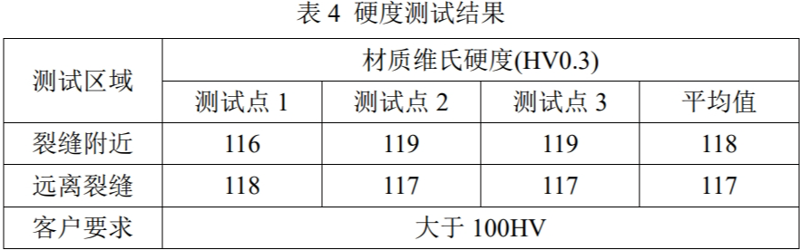 开裂外壳裂缝附近硬度与其他位置硬度无明显差异,均符合客户要求。
