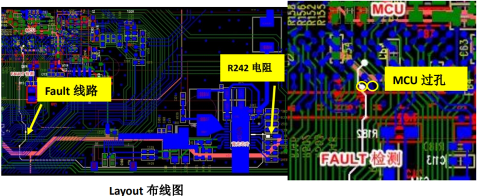 通过分析客户提供的Layout图,发现fault线路(图中白线)上MCU芯片一端存在电气间距过小的通孔,孔距约0.3mm(11.8mil),有发生CAF的风险。结合不良现象不稳定,高温高湿后可能会恢复的特点,怀疑通孔位置发生了CAF导致漏电。