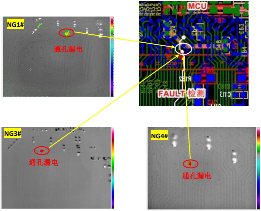 1.Thermal热点分析发现,NG1#,NG3#,NG4#Fault线路上与MCU相连的通孔存在漏电现象;