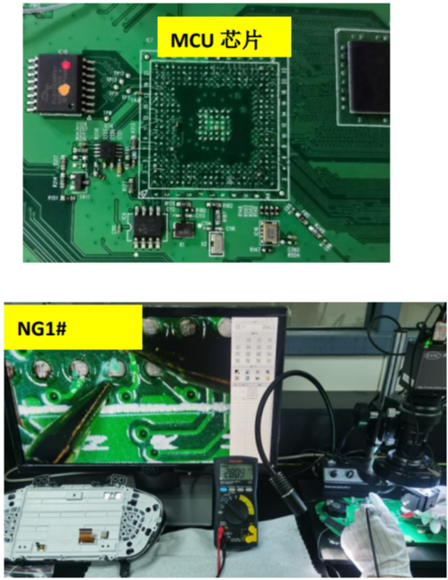 NG1#,MCU连接的通孔与旁边的通孔间异常发热,存在漏电;
