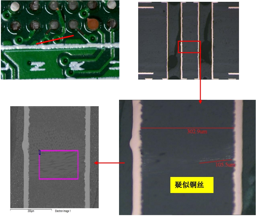 2.NG1#切片测试,在两漏电的通孔间发现了疑似铜丝;