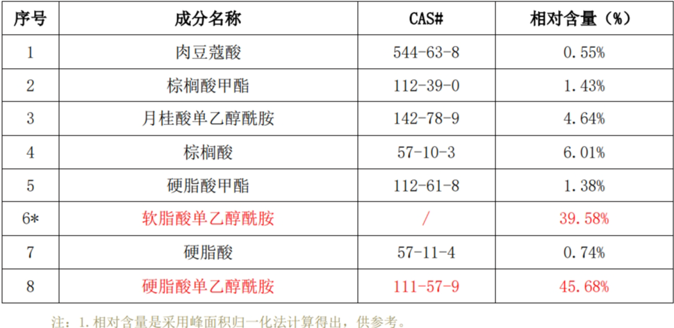 白色异物主要成分为软脂酸单乙醇酰胺和硬脂酸单乙醇酰胺,这两种物质主要作为塑料的润滑剂和抗静电剂。
