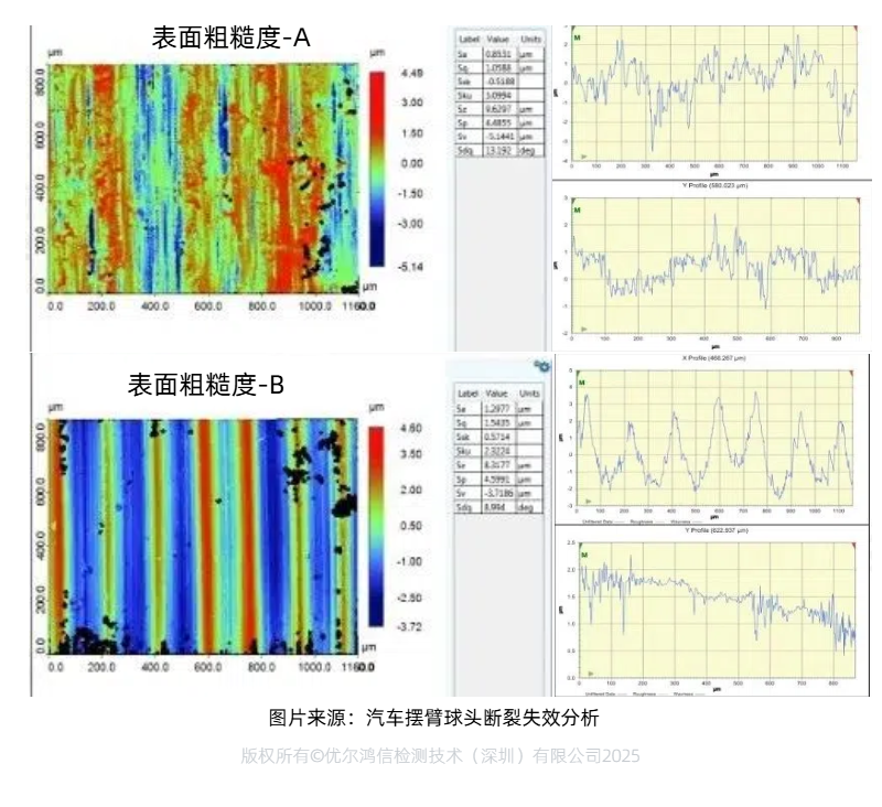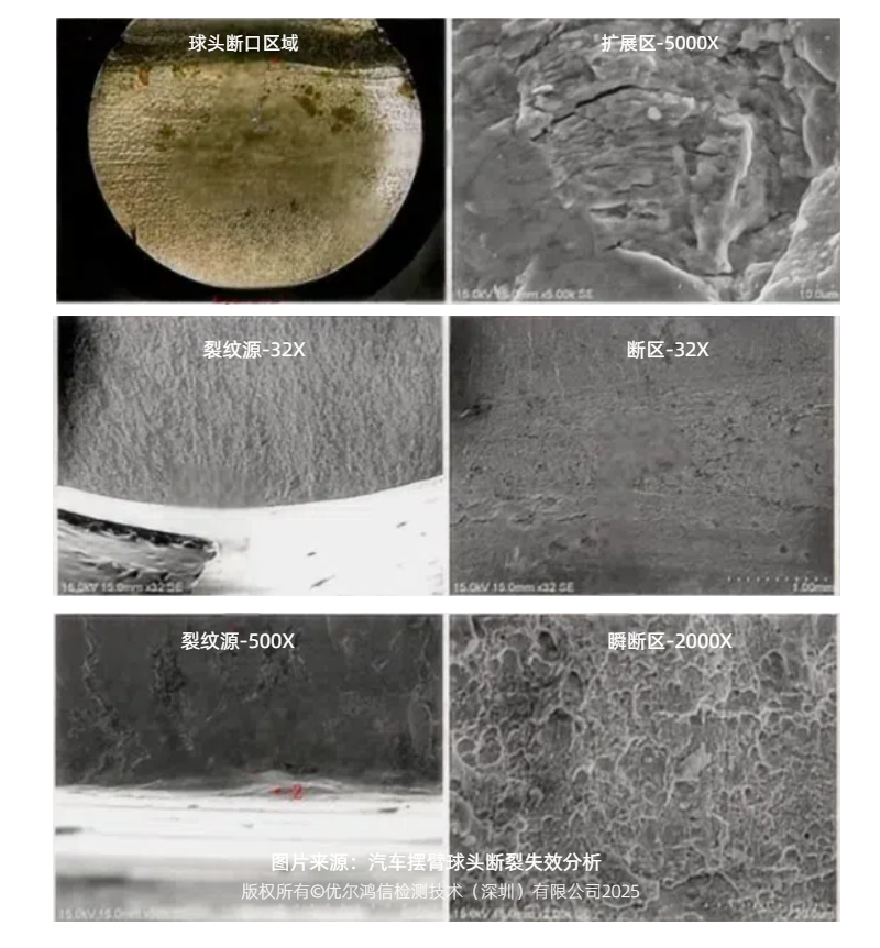 理想情况下,汽车前下摆臂球头总成的易断裂位置应位于其根部。然而,实际断裂却发生在球头圆弧底部。由于断面扩展区面积差异较大,推测球头与固定侧之间存在装配不良(如上部装配过紧,下部装配过松),导致圆弧位置额外受力且受力不均。这种受力不均在外表面存在的刀纹和缺损处引发了应力集中,进而在交变应力的作用下导致了疲劳断裂。