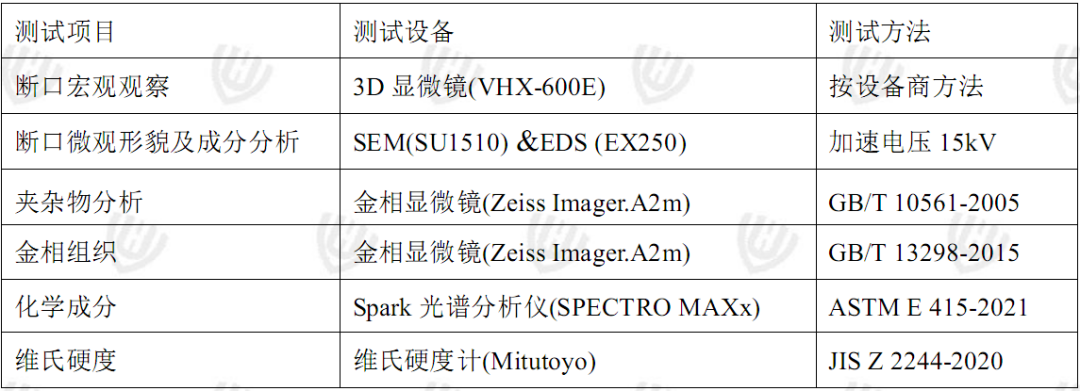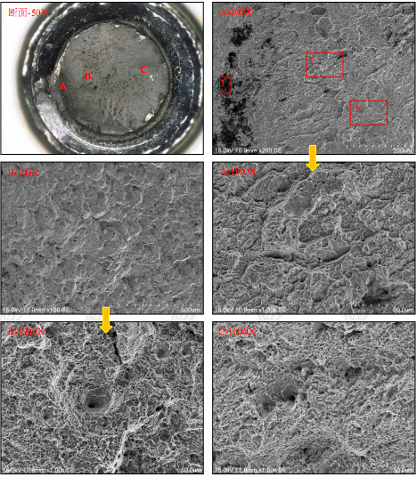 小结:断口A区域为解理河流花样,部分位置存在明显铁锈,B区域存在明显的扩展台阶,微观形貌为细小的韧窝形貌,C区域瞬断区为典型的等轴韧窝形貌,断面整体为韧性断裂,整个断口表面未发现其他异常元素存在。EDS成分数据为半定量分析,结果仅供参考,所给成分为质量百分比。