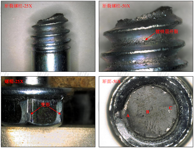 小结:对断裂螺栓进行宏观观察发现,断裂位置存在轻微颈缩现象,且断面与螺栓轴向呈近似45°方向,为典型的扭转剪切断口;不良样品螺牙根部镀锌层明显开裂,且螺帽位置也有明显的变形现象,说明螺栓断裂前受力较大;断面A位置呈深灰色,推测为裂纹源,位于螺纹近螺牙根部, B区域呈灰色,有明显的扩展台阶,为裂纹扩展区,C区域为浅灰色,为断口瞬断区。