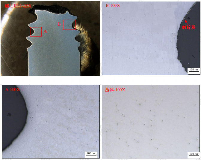 小结:螺栓左右两侧的螺牙根部均无明显裂纹存在,螺牙根部镀锌层有明显破坏痕迹,螺栓基体中并无较大的气孔或夹杂物存在,根据GB/T 10561-2023对基体中非金属夹杂物进行评级,基体夹杂物为D类,级别为2.0级。