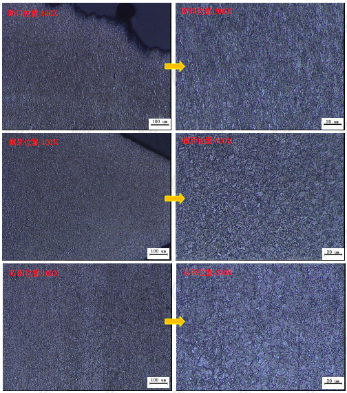 小结:从断口位置金相组织可以看出,断口处晶粒明显沿一定方向被拉长,说明该位置断裂前有明显受力情况;螺栓芯部与螺牙组织相对均匀,均为回火索氏体,说明材料经过调质处理,参照GB/T 3098.1-2010,断裂螺栓的金相组织符合要求。