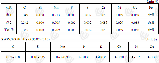 小结:以上所给成分均为质量百分比;参照JIS G 3507-2010,断裂螺栓化学成分符合SWRCH35K的规格要求。