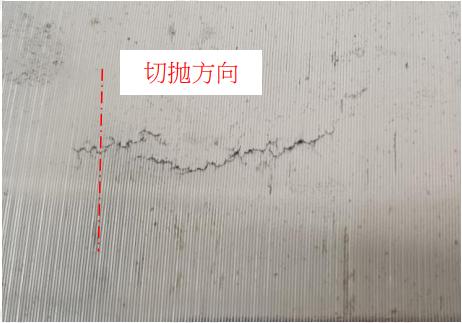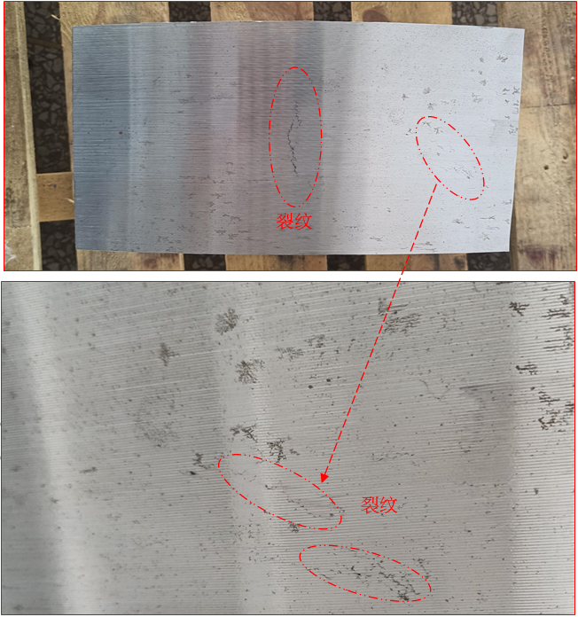产品在调质处理后目视未发现缺陷,在半精加工外圆时也未发现裂纹,但在后续外圆精加工后发现2处可视裂纹。裂纹位置及样品状况如下图所示。