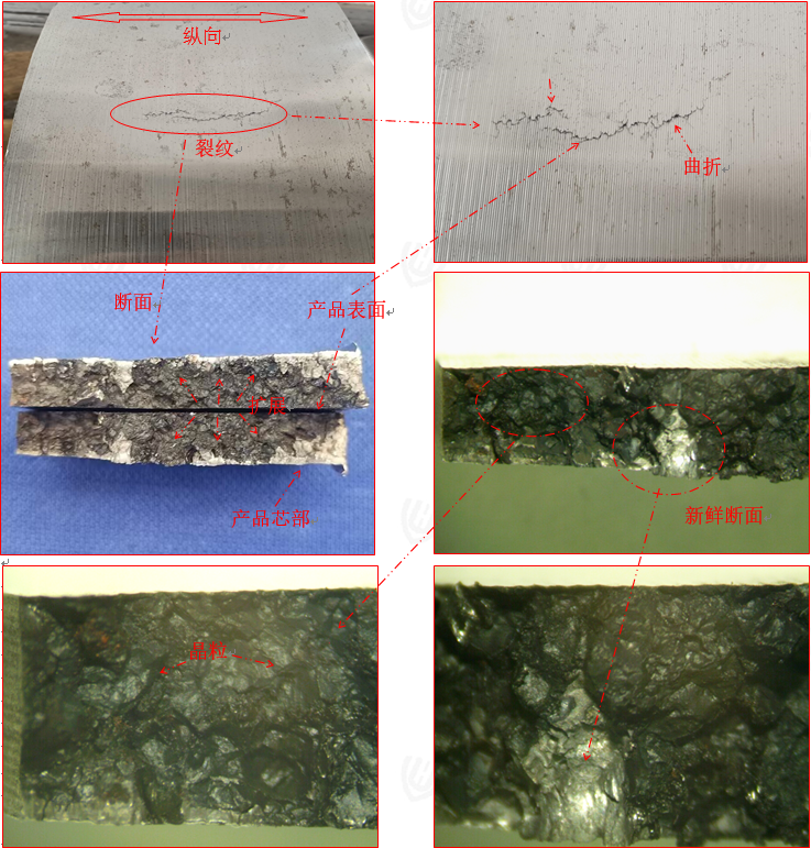 1.产品开裂分多个阶段,在热处理加工工艺中存在过热现象;整体看,裂纹自表面产生,向产品芯部方向扩展;产生于高温锻造或高温淬火工艺过程中;