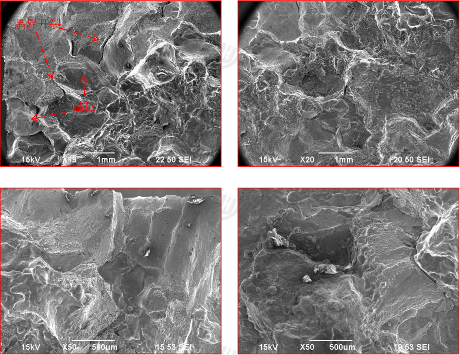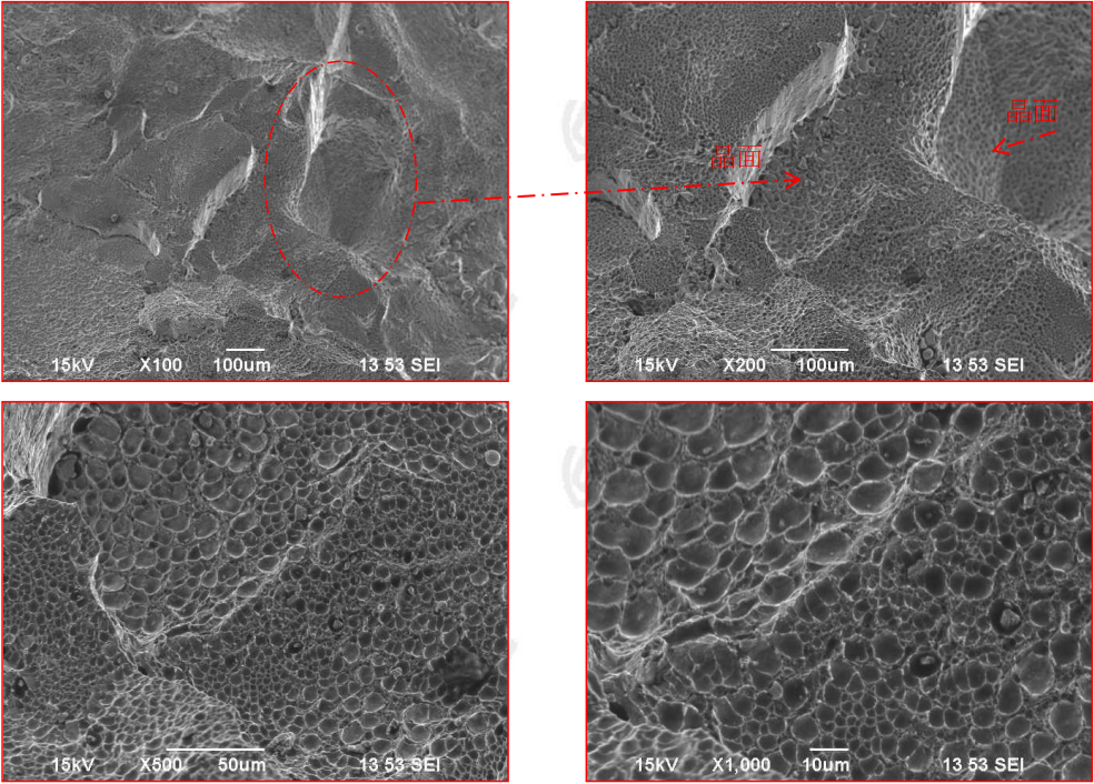 观察发现,后期产生之新鲜断面区域与灰黑色区域微观存在明显之差异,新鲜断面微观呈多孔状韧窝形貌,孔洞分布于晶面之上。该现象多发生于过热组织晶界处,孔洞连接破坏晶界连续性,使其力学性能恶化,形成沿晶开裂等缺陷。