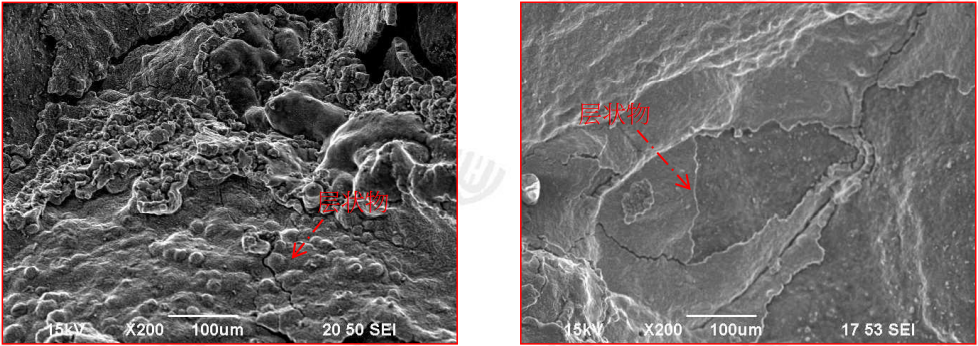 观察发现,断口灰黑色区域局部微观呈沿晶开裂形貌,晶粒轮廓明显,存在晶界开裂之二次裂纹。同时断口表面覆盖大量层片状物质,存在开裂及剥离现象。