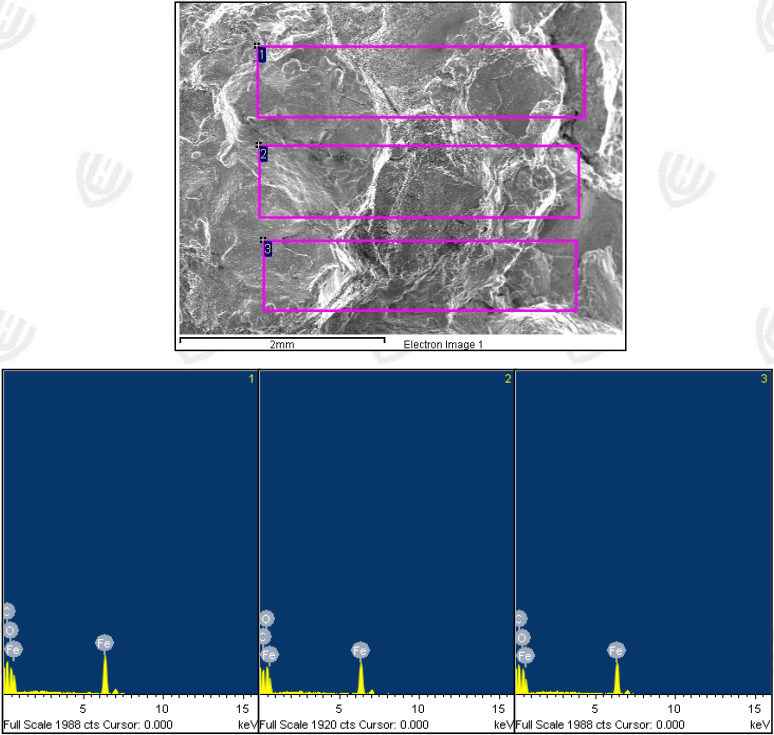 对断口表面黑色物质进行EDS成分分析,主要为C、O、Fe元素,C、O元素占比较高,未见其他异常物质,结合其层片状形貌特征推断为高温产生的氧化皮物质。