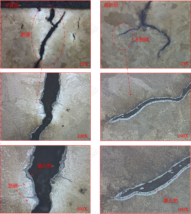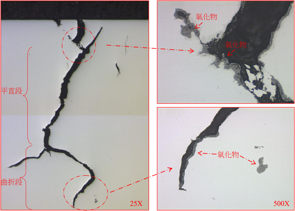 切片观察发现,开裂应起源于产品表面及次表面,向基体内部扩展。裂纹前段较为平直,后段分叉曲折扩展。裂纹平直段及尾端曲折段内部均存在灰色氧化物,该类氧化物一般产生于高温环境下。