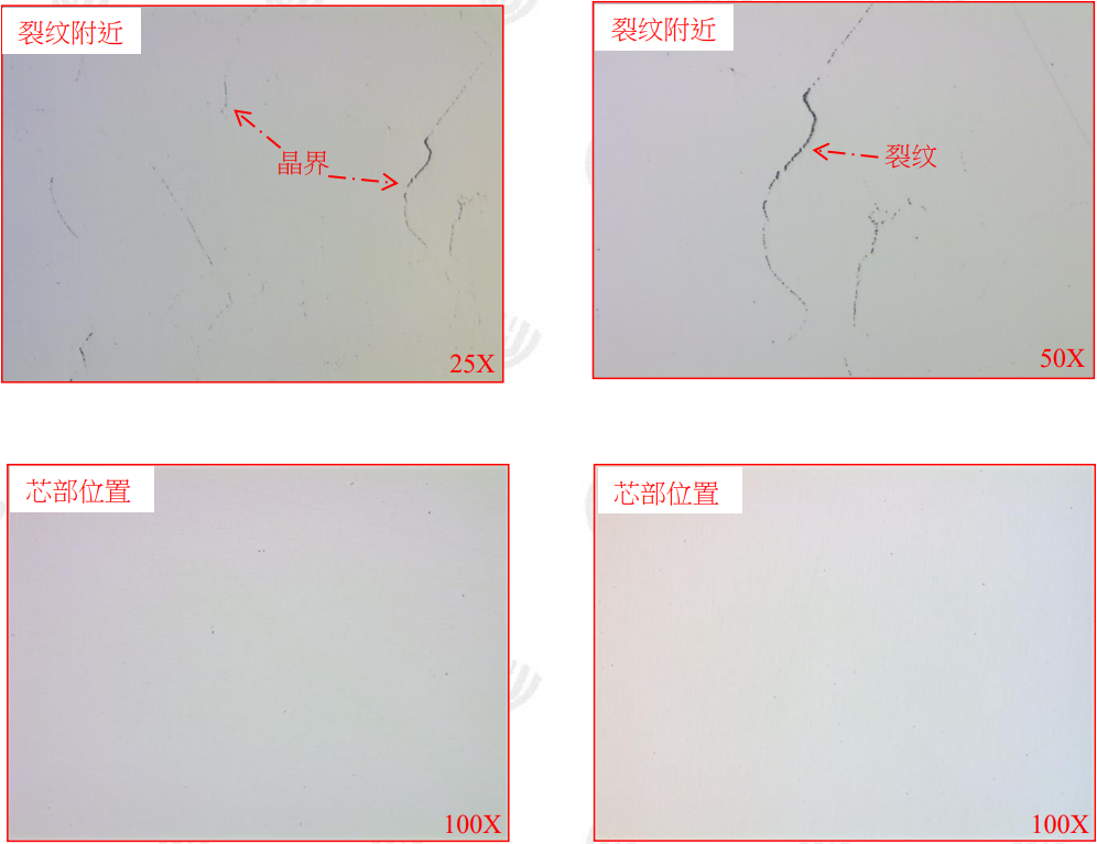 对表面裂纹区域及芯部区域进行晶粒度评级。