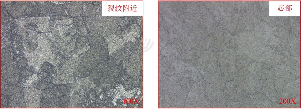 表面晶粒尺寸为0.1190mm,依据GB/T 6394-2017标准,评定为2.5级;芯部晶粒尺寸为0.0823mm,评定为3.5级,表面及芯部晶粒均较为粗大,且靠近表面区域晶粒粗大更为明显,晶粒粗大会导致材料塑性及韧性均大大降低。晶粒过大表明该产品在热处理加工工艺中存在过热现象。