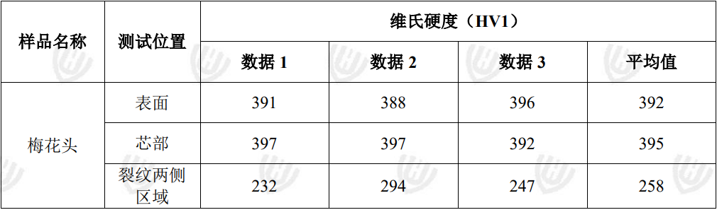 硬度测试发现,失效产品表面与芯部硬度基本一致。裂纹两侧区域硬度较低且不均匀,这是由于裂纹两侧脱碳且分布不均匀所致。