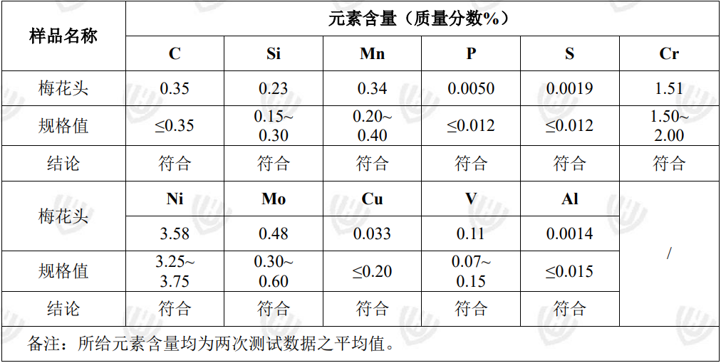 所检元素含量均符合JB/T7022-2014标准中30Cr2Ni4MoV技术规定之要求。