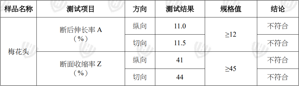 拉伸试验发现,反映该产品韧性指标的断后伸长率及断面收缩率均低于规格值之下限,不符合产品设计之要求,进一步证明该产品存在韧性不足的缺陷。